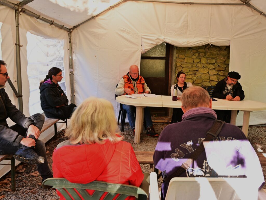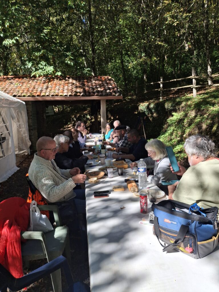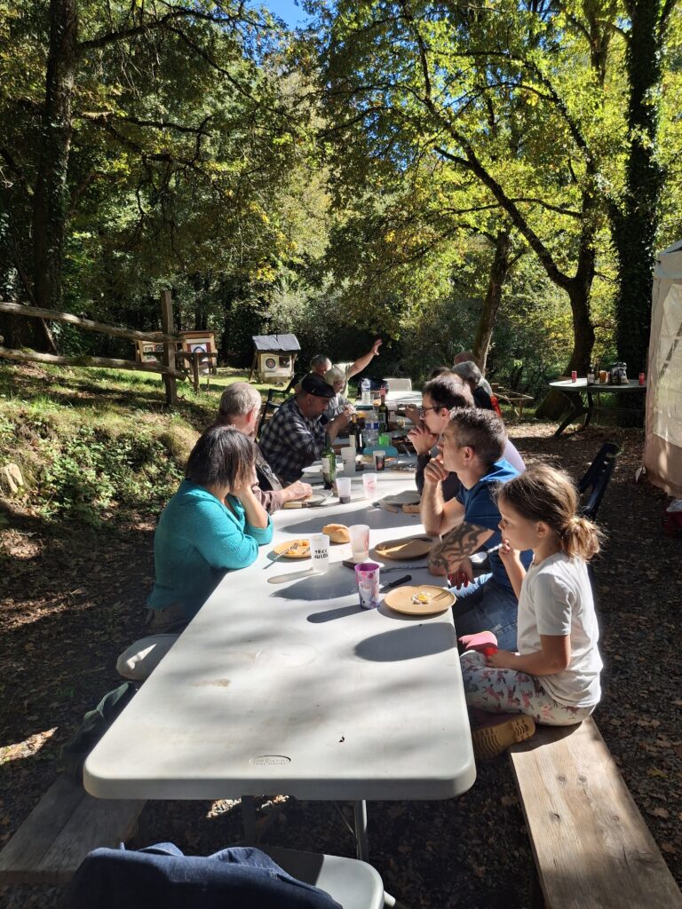Souhaitant profiter d’un moment chaleureux sous les rayons du soleil d’automne, nous avons installé quelques tables le long du barnum et partagé un apéritif et un repas (très attendu par certains 🤤) : pâté et délicieux effiloché de cochon aux pommes de terre, offerts par Philippe Ribadière, que nous remercions chaleureusement, ainsi que des gâteaux confectionnés par certains des convives, que nous remercions également.